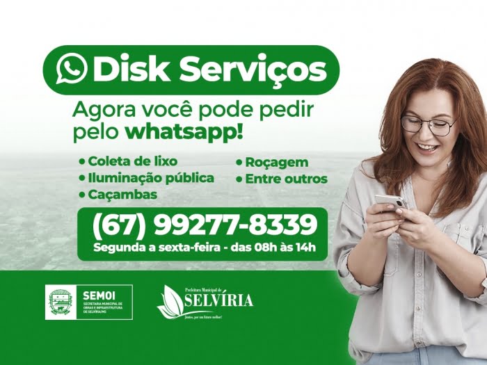 A partir de agora, serviços como coleta de lixo, iluminação pública, caçamba, roçagem, entre outros, poderão ser feitos diretamente pelo WhatsApp (67) 9277-8339.