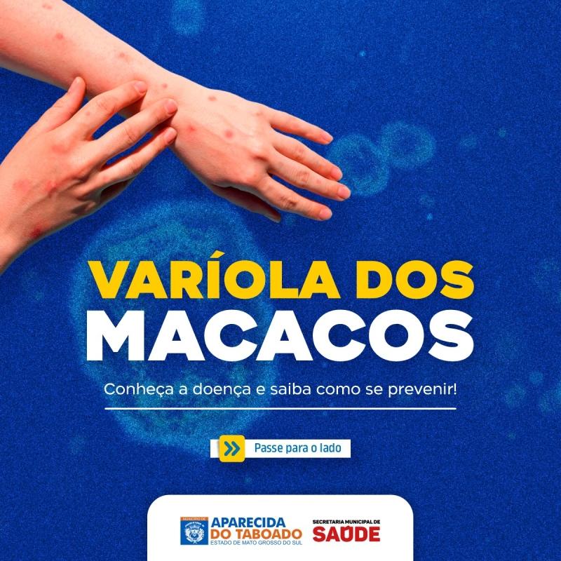 A Secretaria Municipal de Saúde de Aparecida do Taboado alerta que a monkeypox ou varíola dos macacos não tem relação direta com os animais, apesar do nome. Ela é uma doença zoonótica viral e sua transmissão ocorre por contato próximo com lesões, fluídos corporais, gotículas respiratórias e materiais contaminados como roupas de cama.