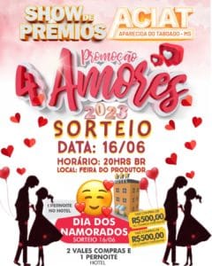 Aparecida do Taboado (MS) – Nesta sexta-feira (16), a Associação Comercial e Industrial (ACIAT) com apoio da Administração Municipal e Sindvarejo, realizará o segundo sorteio da promoção “4 amores”. A campanha que acontece anualmente com objetivo de incentivar os aparecidenses a comprarem no comércio local.