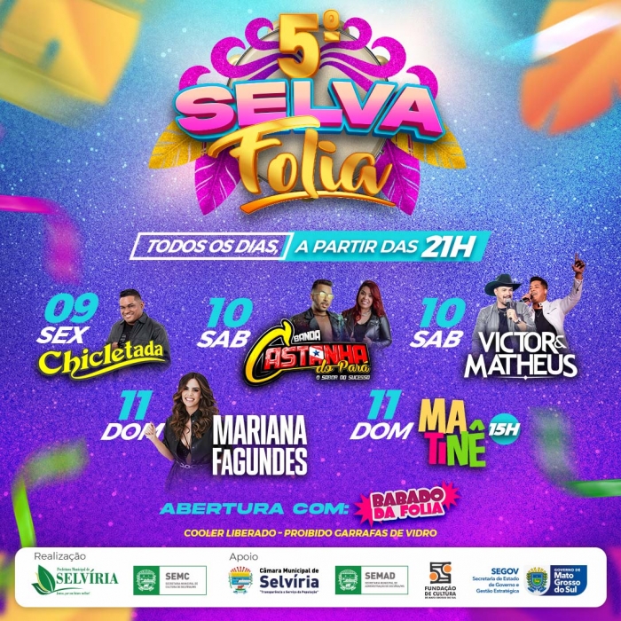 A 5ª edição do Selva Folia, que será realizado de 9 à 11 de fevereiro, terá quatro shows e matinê. O evento, realizado pela Prefeitura de Selvíria, por meio da Secretaria de Cultura, com o apoio do Governo do Estado do Mato Grosso do Sul, da Fundação de Cultura do Mato Grosso do Sul e da Câmara Municipal, terá entrada gratuita.
