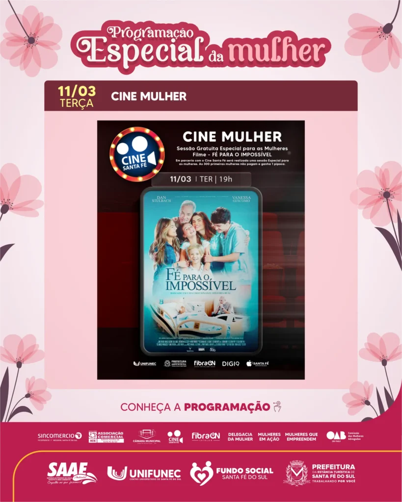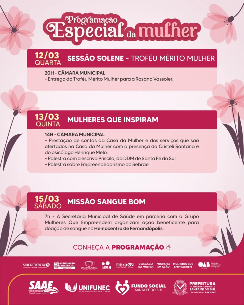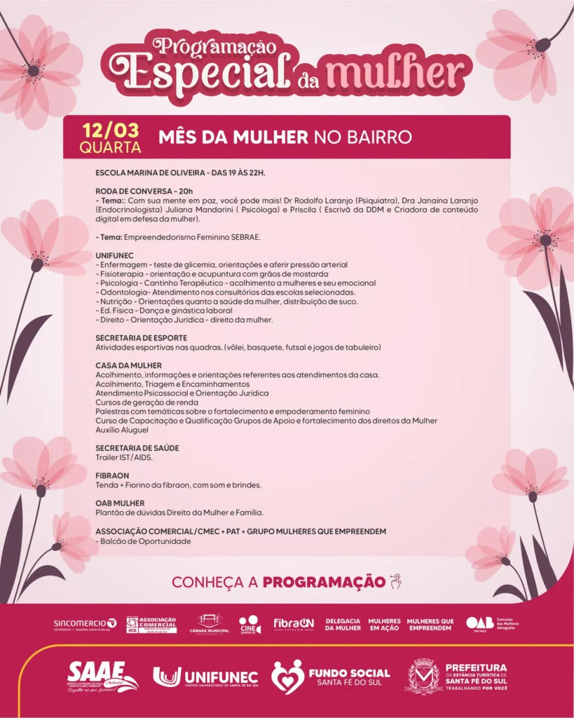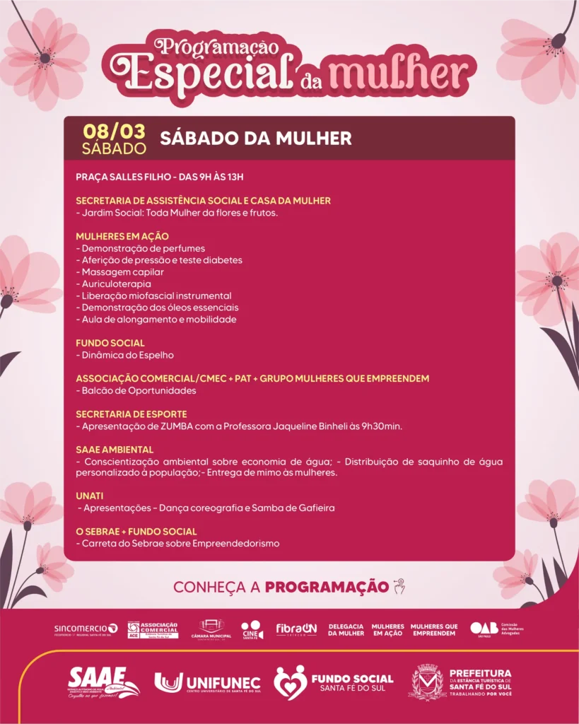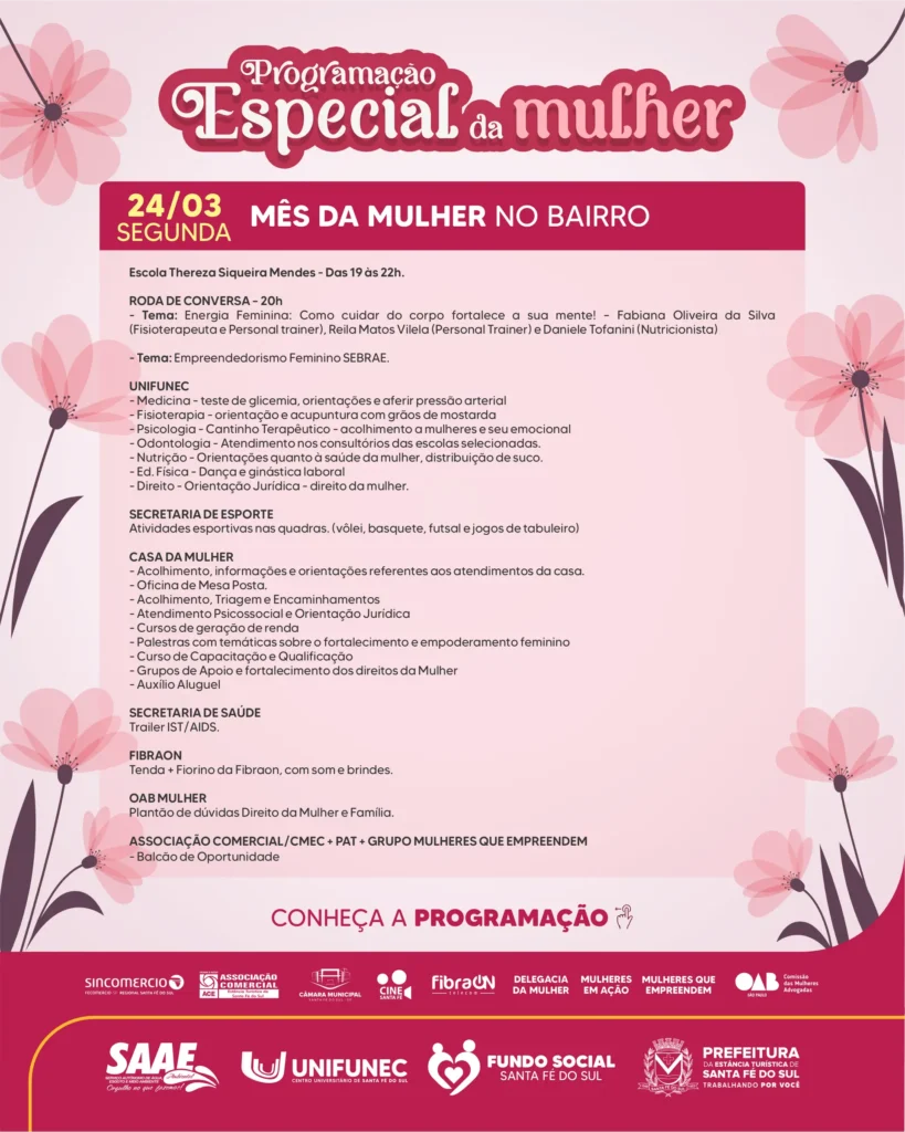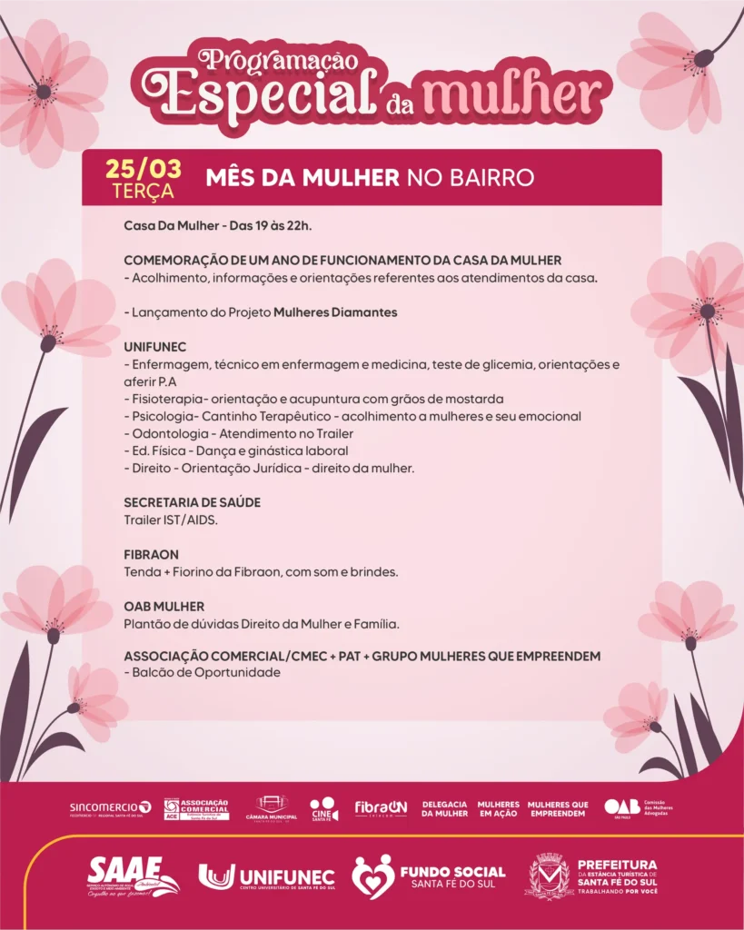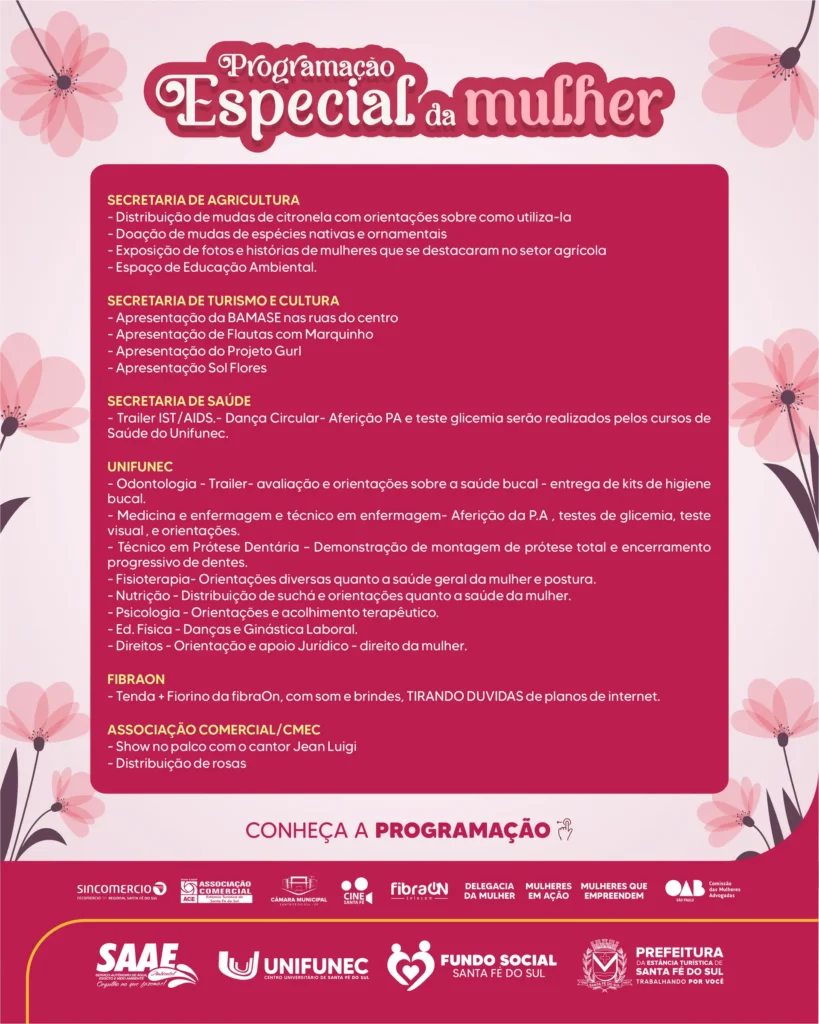 Para comemorar o DiaInternacional da Mulher, celebrado em 8 de março, a Prefeitura da Estância Turística de Santa Fé do Sul, em parceria com o Fundo Social de Solidariedade, Unifunec, Saae Ambiental e Câmara Municipal, prepararam um mês de março, com diversas atrações e atendimentos gratuitos voltadas às mulheres do município.