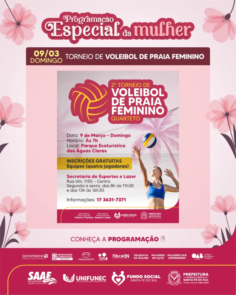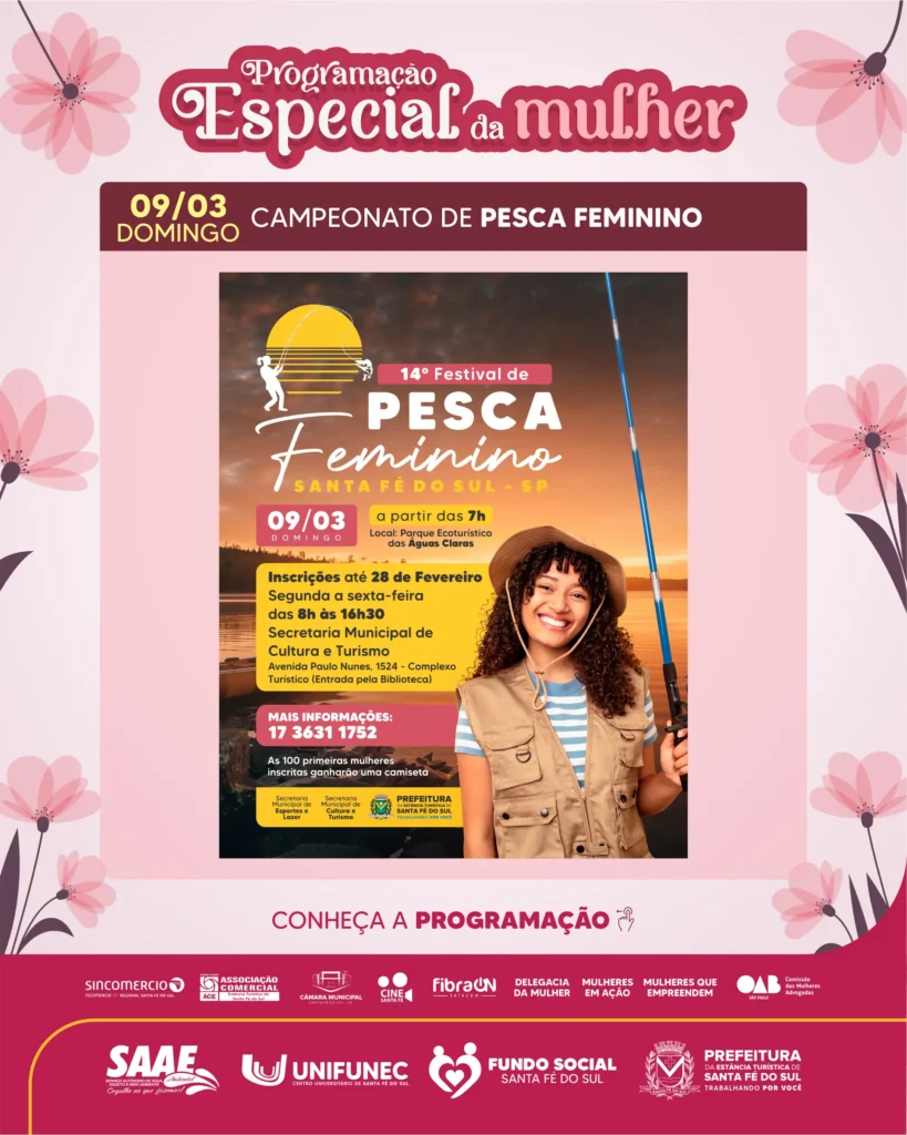 A programação especial inicia no sábado (08), na Praça Salles Filho, com diversos atendimentos gratuitos. No domingo (09), a diversão é garantida com o 14º Festival de Pesca Feminina e o 2º Torneio de Voleibol de Praia Feminino, a partir das 7h no Parque Ecoturístico das Águas Claras e na terça-feira, 11, às 19h sessão de cinema especial com o filme Fé para o impossível.