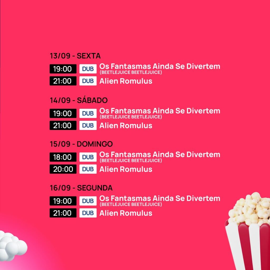 A programação acontecerá entre os dias 13 a 16 de setembro com dois filmes em cartaz, sendo a sequência do clássico, Os Fantasmas Ainda Se Divertem (Beetlejuice Beetlejuice), e a novidade da semana, o filme Alien Romulus.