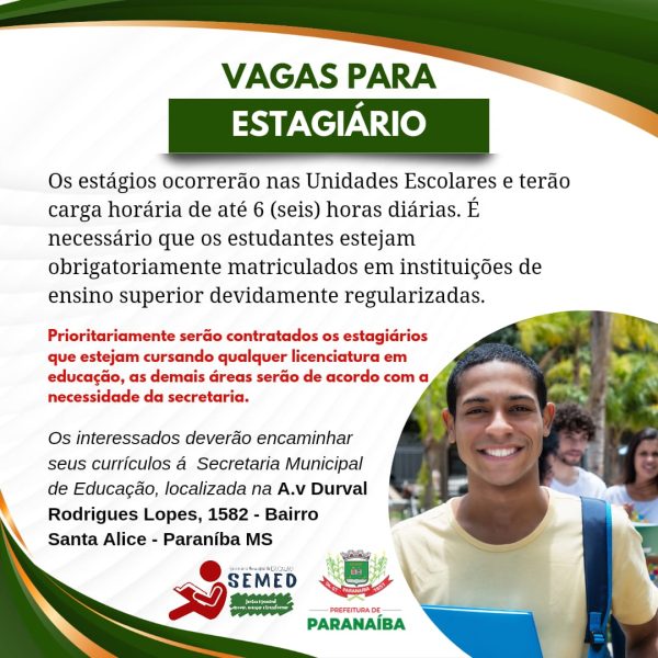 A Prefeitura de Paranaíba, por meio da Secretaria Municipal de Educação, irá contratar estagiários. Os interessados deverão encaminhar seus currículos na sede da secretaria, localizada na Avenida Durval Rodrigues Lopes, 1582, Santa Alice, das 7h às 13h.