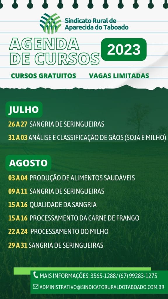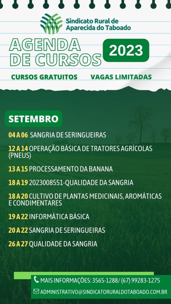 Aparecida do Taboado (MS) – Já está disponível nas redes sociais do Sindicato Rural a agenda de cursos gratuitos para os meses de agosto e setembro. Os aparecidenses poderão escolher entre os 16 cursos que serão realizados em parceria com o Senar/MS.