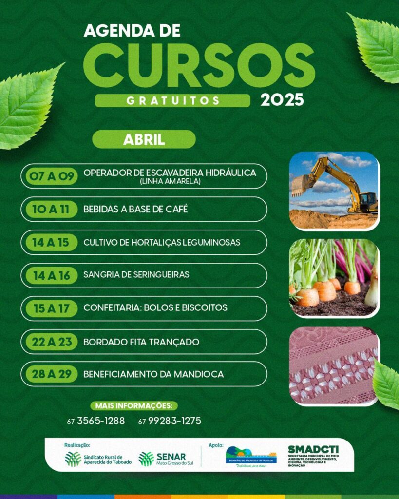 Aparecida do Taboado (MS) – Com sete cursos disponíveis para o mês de abril, o Sindicato Rural divulgou a agenda dos cursos gratuitos realizados em parceria com o Senar MS e apoio da Prefeitura Municipal e da Secretaria de Meio Ambiente, Desenvolvimento, Ciência, Tecnologia e Informação.