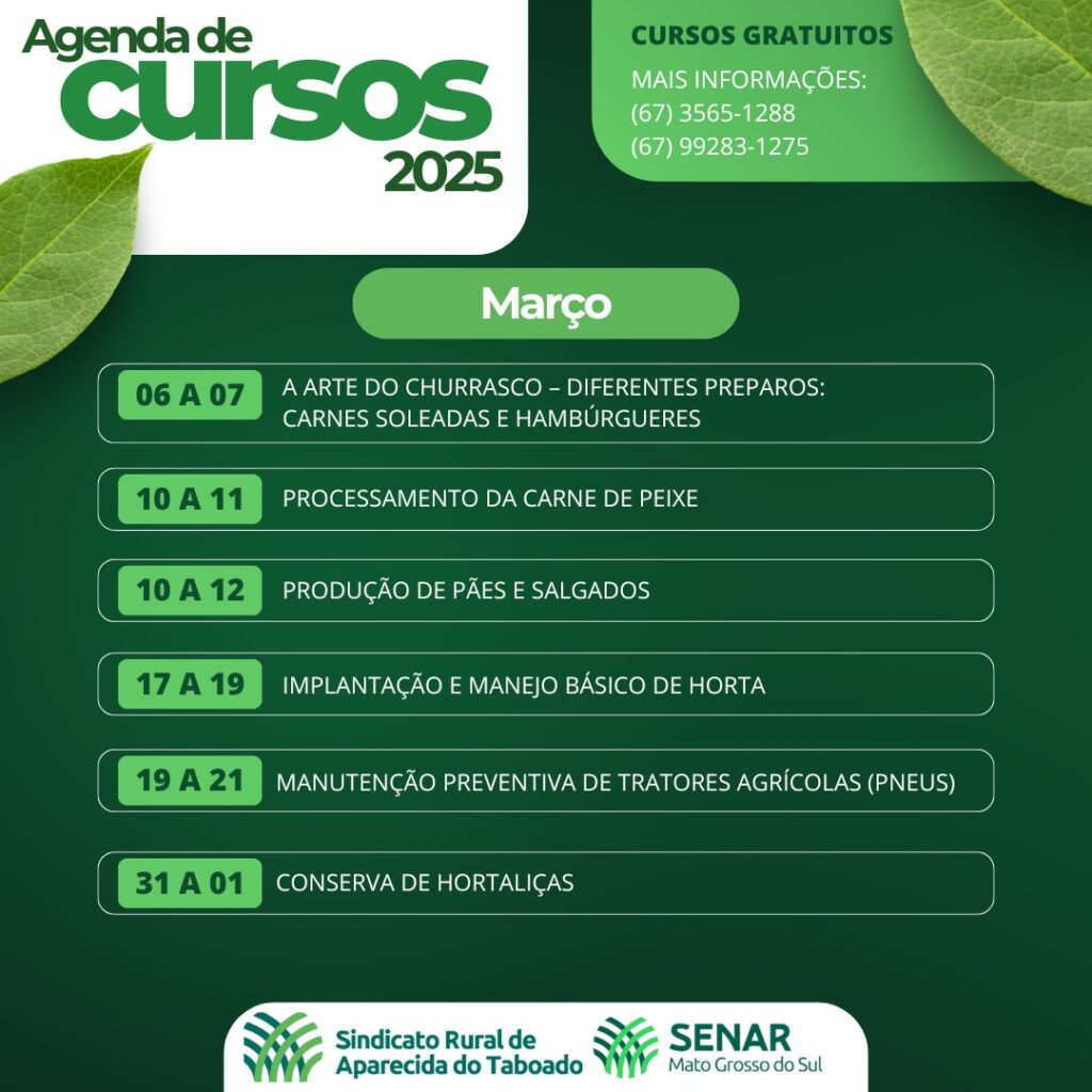 Aparecida do Taboado (MS) – Com seis cursos disponíveis para o mês de março, o Sindicato Rural divulgou a agenda dos cursos gratuitos realizados em parceria com o Senar MS.