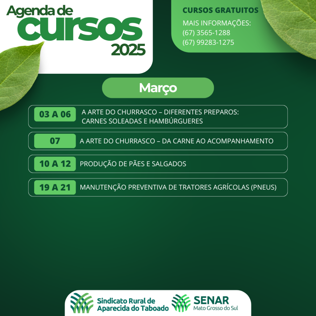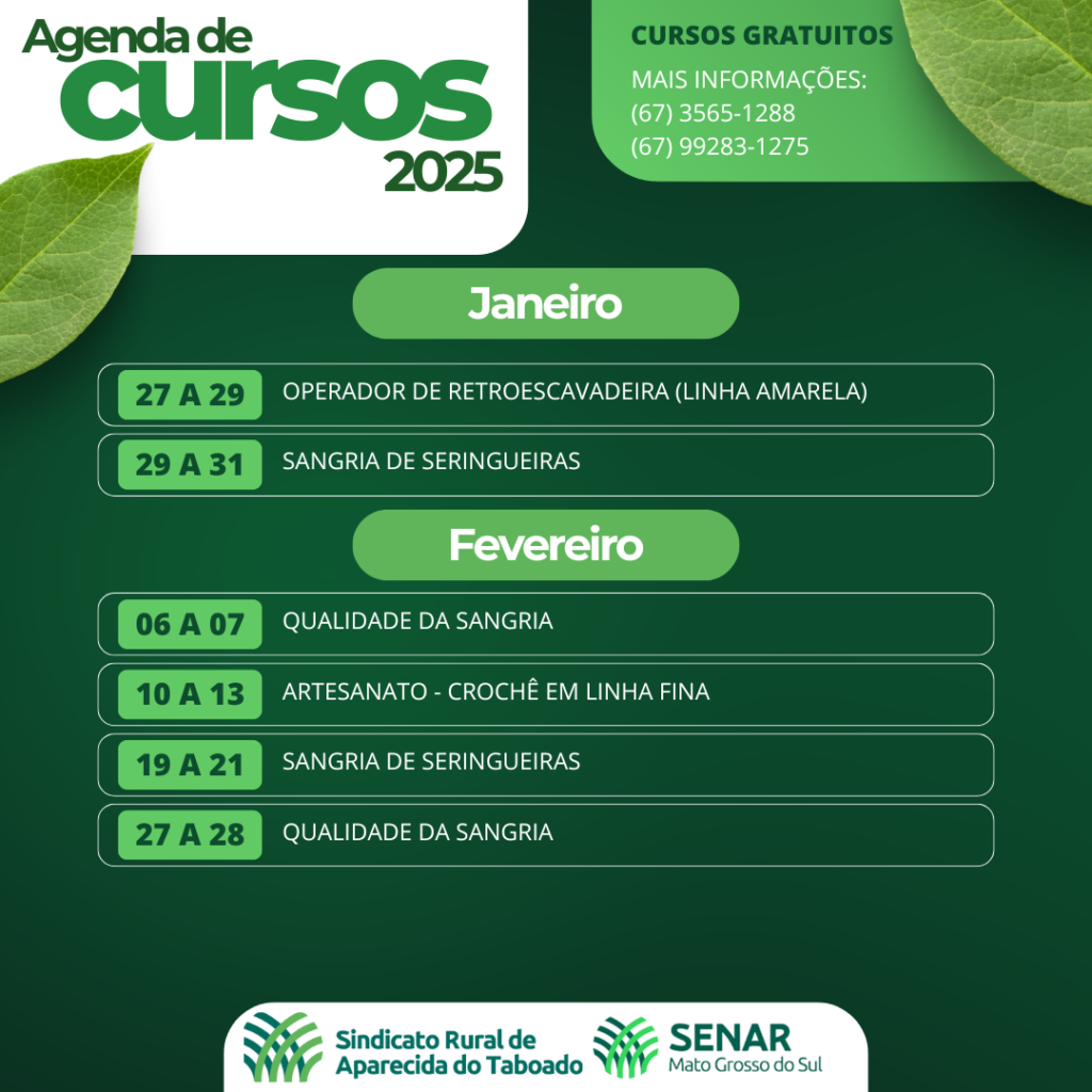 Nesta terça-feira (15), o Sindicato Rural de Aparecida do Taboado divulgou a primeira agenda de cursos gratuitos do ano para os meses de janeiro, fevereiro e março com o total de 10 cursos.