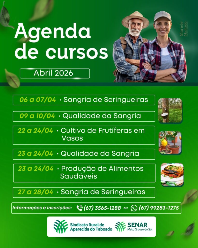 O Sindicato Rural de Aparecida do Taboado, em parceria com o SENAR/MS, divulgou a programação de cursos para o mês de abril. A iniciativa busca fortalecer o desenvolvimento local por meio da qualificação prática e do acesso a novos conhecimentos.