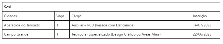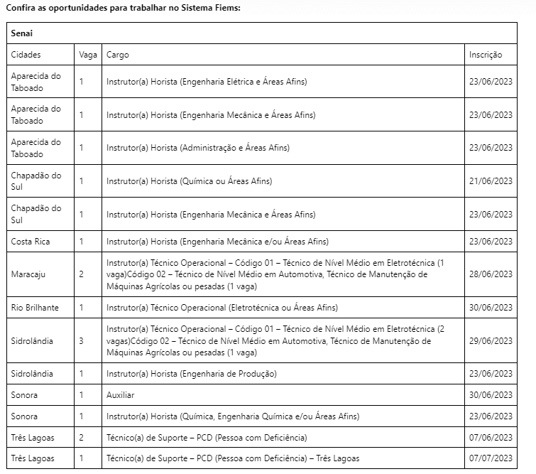O Sistema Fiems está com processos seletivos abertos para a contratação de profissionais de diversas áreas de atuação. Ao todo, há 20 vagas disponíveis para trabalho nos seguintes municípios: Aparecida do Taboado, Chapadão do Sul, Costa Rica, Maracaju, Rio Brilhante, Sidrolândia, Sonora, Três Lagoas e Campo Grande. Os processos seletivos visam atender as necessidades do Sesi e do Senai.
