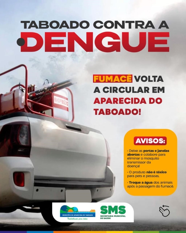 Importante: o produto utilizado no fumacê não é tóxico para pessoas ou animais domésticos, mas recomenda-se trocar a água dos animais após a passagem do fumacê. A colaboração de todos é essencial para combater o mosquito Aedes aegypti e prevenir surtos de dengue na cidade.