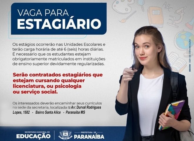 A Prefeitura de Paranaíba, por meio da Secretaria Municipal de Educação, irá contratar estagiários que estejam nos cursos de Licenciatura, Psicologia ou Serviço Social. Os interessados deverão encaminhar seus currículos na sede
