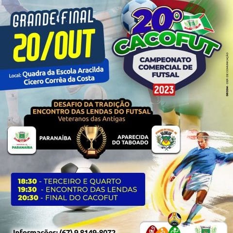 MaisA Secretaria Municipal de Esporte e Lazer realizará nesta sexta-feira (20), a grande final do Campeonato Comercial de Futebol – CACOFUT na quadra da Escola Aracilda Cicero Corrêa da Costa, a partir