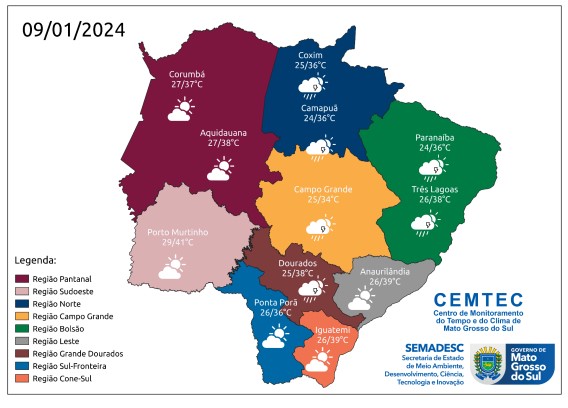 Campo Grande tem previsão de mínima de 25°C e máxima de 34°C. Já em Porto Murtinho, na região de fronteira, a temperatura poderá chegar a 41°C, com mínima de 29°C. Corumbá vai variar entre 27°C (mínima) e 37°C (máxima). Já na região norte, em Coxim fica entre 25°C e 36°C.