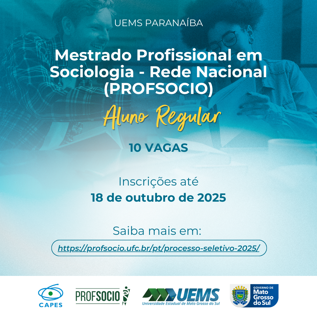 A Universidade Estadual de Mato Grosso do Sul (UEMS), Unidade Universitária de Paranaíba, oferta 10 vagas no Mestrado Profissional de Sociologia em Rede Nacional (Profsocio). O processo seletivo está aberto, com inscrições até 18 de outubro. UEMS é a única instituição pública do estado a integrar a rede nacional do programa, consolidando-se como um polo estratégico de formação docente voltado à valorização e qualificação de professores da educação básica.