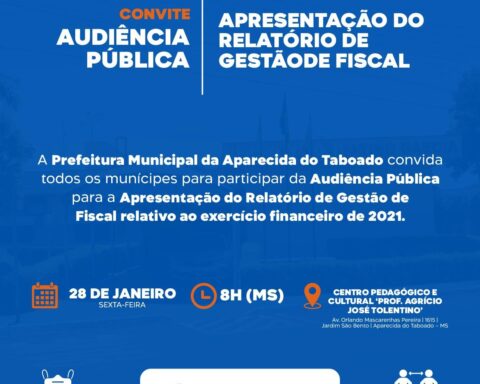 MaisA Administração Municipal de Aparecida do Taboado vai realizar nesta sexta-feira, dia 28 de janeiro, importante audiência pública de gestão fiscal.
