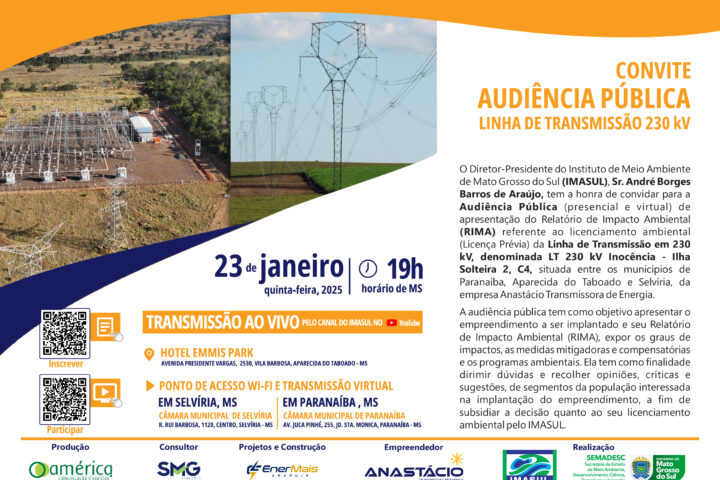 MaisEDITAL DE DIVULGAÇÃO De acordo com a Portaria IMASUL n. 812, de 29 de setembro de 2020, o empreendedor ANASTÁCIO TRANSMISSORA DE ENERGIA do empreendimento Linha de Transmissão em 230 kV, denominada