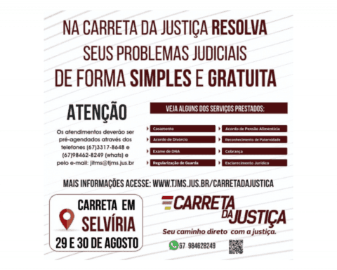MaisNos dias 29 e 30 de agosto, a Carreta da Justiça estará em Selvíria, realizando diversos tipos de atendimentos gratuitos. Essa ação faz parte do Programa Judiciário em Movimento, do Tribunal de
