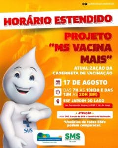 Através do Projeto “MS Vacina Mais”, a secretaria de Saúde de Aparecida do Taboado estará realizando no dia 17 de agosto, na Estratégia de Saúde da Família – ESF Jardim do Lago, a campanha de vacinação contra influenza (gripe) e também a atualização da carteira de vacinação em horário estendido.