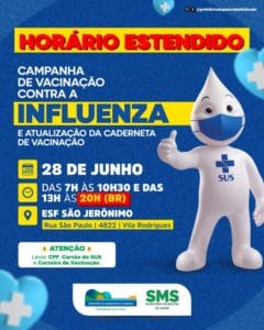 No dia 28 de junho (quarta-feira), ocorrerá a campanha de vacinação contra influenza e também a atualização da carteira de vacinação, oportunidade em que trabalhadores que não tem como ir no horário de expediente, poderão comparecer à ESF São Jerônimo até às 20h. Os usuários de todas as ESF´s podem comparecer.