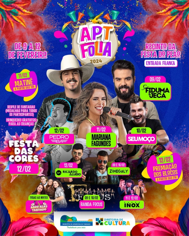 A Festa das Cores no dia 12 de fevereiro vai trazer um diferencial para 2024, além do desfile de fantasias e a entrega de medalhas para todos os participantes, proporcionando momentos memoráveis para todos os presentes. É hora de se preparar para uma celebração inesquecível no ‘APT Folia 2024’!