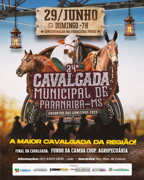 As Secretarias Municipais de Cultura, Turismo, Governo, Obras, Demutran e a Prefeitura de Paranaíba, anunciam a 34ª Cavalgada Municipal de Paranaíba, que acontecerá dia 29 de junho.