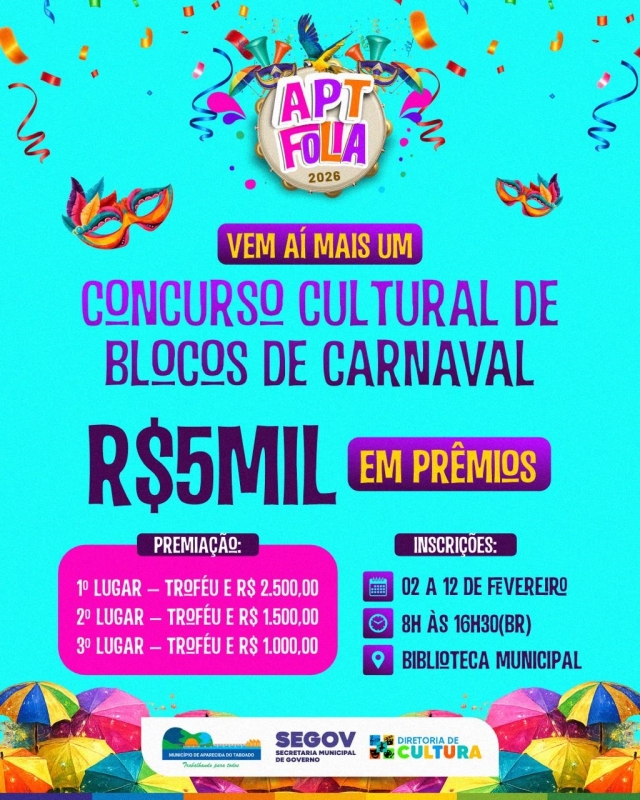 O concurso é uma realização da Secretaria de Governo, por meio da Diretoria de Cultura, com o objetivo de valorizar e fortalecer a tradição carnavalesca do município.