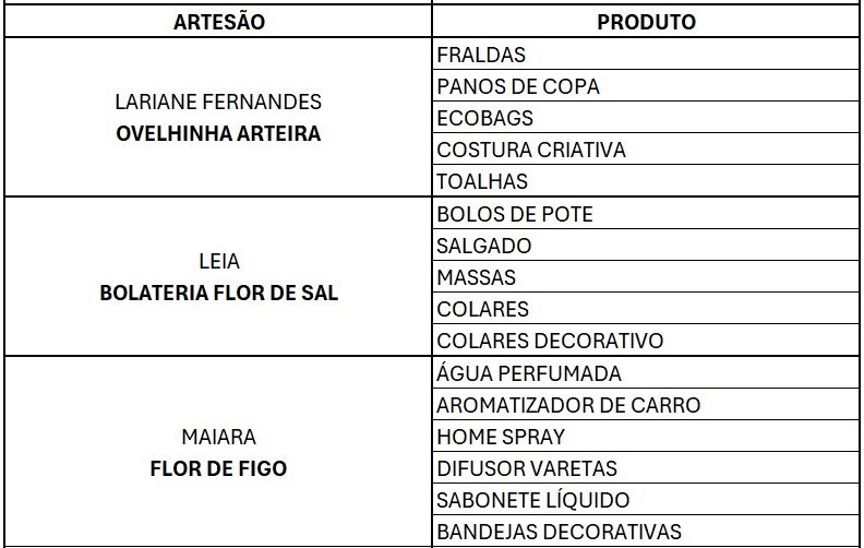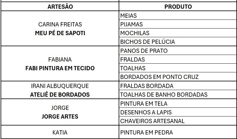 Abaixo, confira a lista dos artesãos e os produtos incríveis que serão expostos: