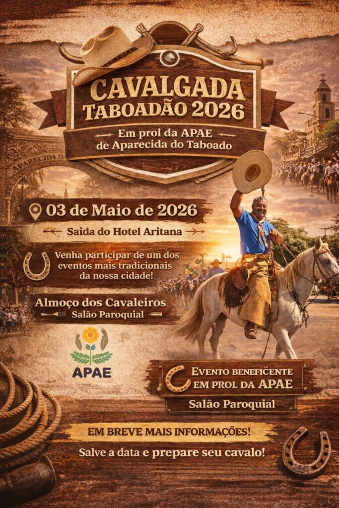 Teve início nesta segunda-feira (30) as vendas dos ingressos para o almoço da Cavalgada Taboadão 2026, evento tradicional de Aparecida do Taboado que será realizado no dia 3 de maio (domingo). A cavalgada é gratuita e aberta à participação da comunidade, enquanto o almoço no Salão Paroquial é pago e tem caráter beneficente em prol da APAE do município.