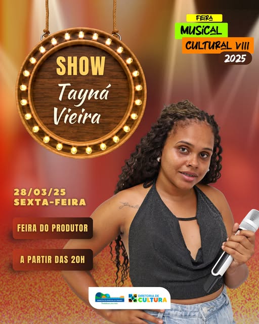A VIII Feira Musical Cultural inicia sua programação de 2025 nesta sexta-feira, 28 de março, com a apresentação da talentosa Tayná Vieira. O show acontece às 20h, na Feira do Produtor, e promete uma noite repleta de emoção e boa música. Não percam. Vá prestigiar e celebrar a cultura local.