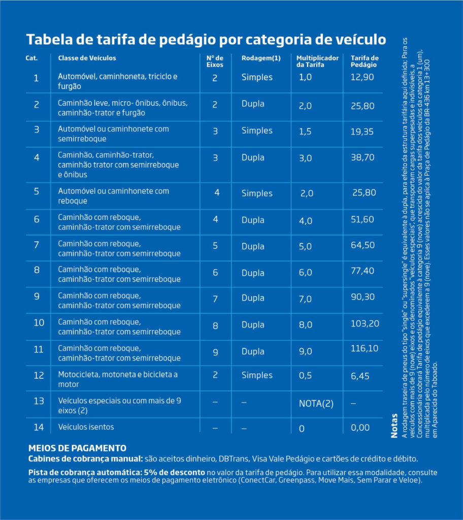 O início da cobrança e o valor das tarifas de pedágio nas praças foram autorizados pela Agência Estadual de Regulação de Serviços Públicos (AGEMS), responsável pela fiscalização do contrato de concessão. A tarifa básica (categoria 1) é aplicada a veículos de passeio; outras categorias de veículos terão preços diferenciados, conforme a tabela abaixo.