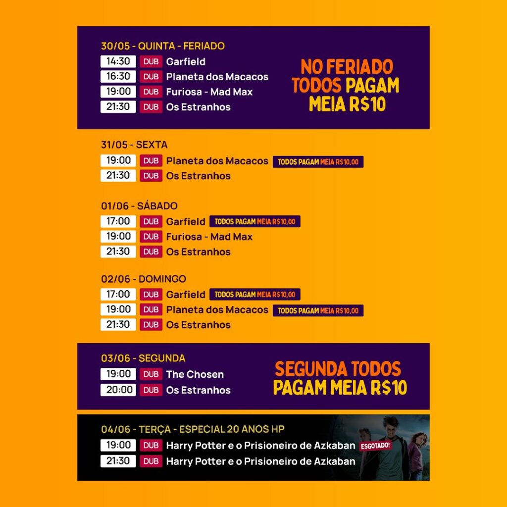 A programação também contará com sessões dos filmes The Chosen e Furiosa: Uma Saga Mad Max, os filmes Garfield e Planeta dos Macacos: O Reinado também estarão disponíveis com um valor promocional no valor de R$10,00.